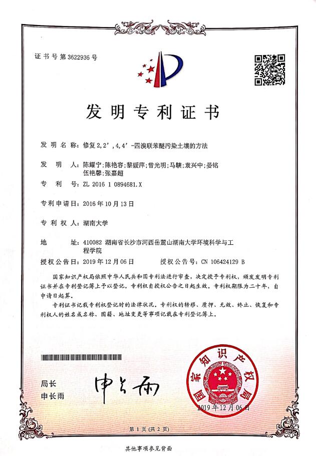 2017级博士生陈艳容、曾光明教授、陈耀宁副教授等申请的1项国家发明专利获得授权