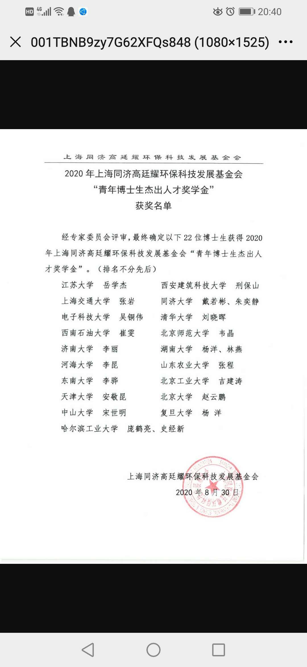祝贺博士生杨洋、林燕入选2020年度高廷耀“青年博士生杰出人才奖学金”