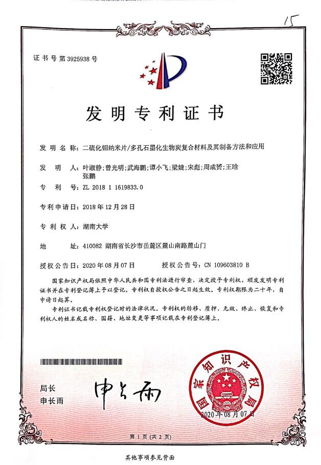 | 2016级博士生叶淑静、曾光明教授、武海鹏教授等申请的1项国家发明专利获得授权: 【发明人】: 叶淑静,曾光明,武海鹏,谭小飞,梁婕,宋彪,周成赟,王晗,张鹏 【发明名称】: 二硫化钼纳米片/多孔石墨化生物炭复合材料及其制备方法和应用 【申请日】: 2018年12月28日 【授权日】: 2020年08月07日 【申请号】: ZL201811619833.0 【专利权人】: 湖南大学 【摘要】: 本发明公开了一种二硫化钼纳米片/多孔石墨化生物炭复合材料及其制备方法和应用,该复合材料以多孔石墨化生物炭为载体,其表面镶嵌有二硫化钼纳米片。其制备方法包括:制备多孔石墨化生物炭粉末;将多孔石墨化生物炭粉末超声分散在水中,加入二水合钼酸钠和硫代乙酰胺进行水热反应,离心,洗涤,干燥,得到本发明复合材料。本发明复合材料具有比表面积大、导电性好、光生电子-空穴对复合率低、光催化活性高、普适性高等优点,其制备方法具有工艺简单、操作简便、成本低廉优点,对环境友好、不产生有毒有害副产物,适合于大规模制备,符合实际生产的需求。本发明复合材料能够快速、高效的处理环境中的如抗生素,具有很好的应用价值和应用前景。 ![]() |