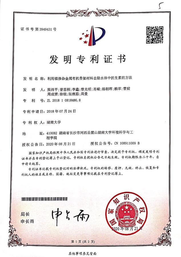 | 2016级博士生熊炜平、博士生曾茁桐、曾光明教授、杨朝晖教授等申请的1项国家发明专利获得授权 【发明人】:熊炜平,曾茁桐,李鑫,曾光明,肖嵘,杨朝晖,赖萃,曹姣,周成赟,徐锐,张燕茹,周曼 【发明名称】:利用镍掺杂金属有机骨架材料去除水体中抗生素的方法 【专利号】:ZL201810818486.8 【专利权人】:湖南大学 【摘要】:本发明公开了一种利用镍掺杂金属有机骨架复合材料去除水体中抗生素的方法,采用镍掺杂金属有机骨架复合材料吸附水体中的抗生素,其中镍掺杂金属有机骨架材料包括MIL-53(Fe),MIL-53(Fe)中掺杂有镍离子。本发明方法采用镍掺杂金属有机骨架复合材料吸附水体中的抗生素,能够高效吸附废水中的抗生素,不仅处理工艺和吸附设备简单、操作方便、成本低,而且吸附容量大、吸附速度快、重复利用率高、清洁无污染,可以被广泛用于去除水体中的抗生素,具有很高的应用价值和商业价值。 ![]() |