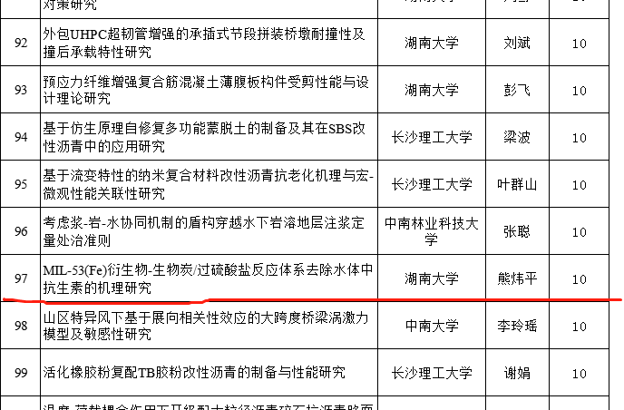 2021年1月19日,长沙市科技局公示了2020年度第二批自然科学基金拟立项目名单,共计299个。我院熊炜平博士、副教授的项目“MIL-53(Fe)衍生物-生物炭/过硫酸盐反应体系去除水体中抗生素的机理研究”将获得资助。对他表示祝贺。![]() 长沙科技网——长沙市2020年度第二批自然科学基金项目公示 |