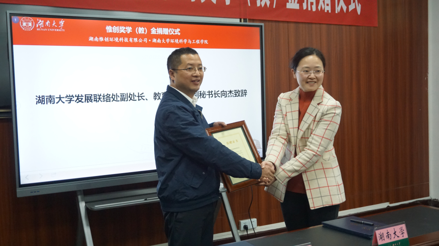 | 2021年4月7日上午,“惟创奖学(教)金”捐赠仪式在湖南大学二办海信会议室举行。湖南惟创环境科技有限公司董事长王志、副总裁杨智姬、研发主管王华、办公室主任黄宏屹、综合部副总经理薛晓妍、企宣经理钟金金一行,与湖南大学发展联络处副处长、教育基金会副秘书长向杰,环境学院院长汤琳教授、党委副书记刘婵和20名环境学院学生代表共同出席捐赠仪式。仪式由环境学院党委委员刘智峰教授主持。 向杰副处长代表学校对湖南惟创科技有限公司的捐赠支持表示感谢,同时表达了对于未来双方深化交流,拓展合作的殷切希望,希望“千年学府”携手优秀的校友企业共创发展新征程。随后,向杰副处长与王志董事长签订了捐赠协议,汤琳院长向其颁发捐赠证书。 王志董事长介绍了公司的发展历程和概况,他表示希望以此奖学金为契机,促进校企合作、产教融合,共同培养国家与社会需要的人才。汤琳院长围绕学科建设、人才培养、研究方向和社会服务等方面介绍了学院的概况。双方就企业的研发方向、校企合作的进一步推进展开交流。 据悉,“惟创奖学(教)金”项目由湖南惟创环境科技有限公司设立,合计向我校捐赠200万元人民币,每年发放10万元,共计20年,用于奖励环境专业的优秀教师和学生。 “惟创奖学(教)金”的设立不仅是在经济与精神上支持了广大学生,而且也体现了企业社会对环保教育事业、环保人才培养的重视与支持。作为对国家对社会的回报,环境院的老师及同学们一致表示将会用实际行动为我国生态文明建设和环境保护事业贡献最大的力量。 ![]() ![]() ![]() ![]() ![]() |
