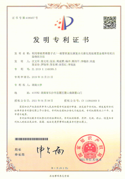 | 2019级博士生汪文军、曾光明教授、张辰副教授等申请的2项国家发明专利获得授权: 1.【发明人】:曾光明,汪文军,张辰,周成赟,杨洋,邵彬彬,黄丹莲,雷蕾,刘钰鑫,熊炜平,符玉葵,王紫薇,周银 【发明名称】:零维黑磷量子点/一维管状氮化碳复合光催化剂及其制备方法 【申请日】:2019年11月21日 【授权日】:2021年01月01日 【专利号】:ZL 201911149467.1 【专利权人】:湖南大学 【摘要】:本发明公开了一种零维黑磷量子点与一维管状氮化碳结合的光催化剂及其制备方法。这种新型光催化剂包括一维管状氮化碳,一维管状氮化碳上负载有零维黑磷量子点。其制备方法包括:将尿素和三聚氰胺为原料制备的一维管状氮化碳悬浮于超纯水中,再加入一定体积0.1mg/mL的零维黑磷量子点混合均匀;将上述混合溶液在冰浴的条件下超声4小时;再用高速离心技术分离得到固体,将此固体置于真空干燥箱中12小时即可得到。本发明得到的零维黑磷量子点与一维管状氮化碳结合的光催化剂具有反应活性位点多、电子-空穴对分离快和稳定性强等优点,并且该制备方法具有操作简单、制备方便和产量高等优点,有着较好的应用价值和应用前景。 2.【发明人】:汪文军,曾光明,张辰,周成赟,杨洋,熊炜平,李晓沛,宋彪,陈亚诗,罗晗倬,贺东辉,田苏红,李旭波 【发明名称】:利用零维黑磷量子点/一维管状氮化碳复合光催化剂处理重金属和有机污染物的方法 【申请日】:2019年11月21日 【授权日】:2021年01月08日 【专利号】:ZL 201911149389.5 【专利权人】:湖南大学 【摘要】:本发明公开了一种零维黑磷量子点与一维管状氮化碳结合的光催化剂处理有机污染物和光催化还原铬离子的方法。包括以下步骤:将零维黑磷量子点与一维管状氮化碳结合的光催化剂与抗生素废水混合达到吸附平衡然后在模拟日光下进行光催化降解,完成对废水的处理;将零维黑磷量子点与一维管状氮化碳结合的光催化剂与重金属铬离子溶液混合然后在模拟日光下进行光催化还原。本发明方法能高效光催化降解废水中的抗生素和还原水体环境中的重金属六价铬离子,具有操作方便、设备简单、污染物去除和重金属六价铬离子还原效率高等优点,是一种可以被广泛采用并有很高应用价值的废水处理和还原六价铬离子的方法。 ![]() ![]() |