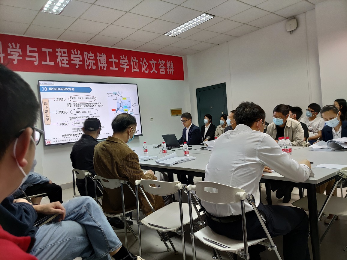 | 博士生梁清华(湖南大学环境科学与工程学院)于2022年4月28日晚在环境馆一楼会议室顺利通过了博士学位论文答辩。 答辩委员会主席: 牛承岗 教授/博导(湖南大学环境科学与工程学院) 答辩委员会委员: 尹笃林 教授/博导(湖南师范大学化学化工学院) 彭兵 教授/博导 (中南大学冶金与环境学院) 张长 教授/博导 (湖南大学环境科学与工程学院) 黄丹莲 教授/博导 (湖南大学环境科学与工程学院) 答辩秘书:李欣 副教授/博导(湖南大学环境科学与工程学院) 梁清华博士生论文题目:基于三聚氰胺自组装的1D g-C3N4基光催化剂的制备及其去除废水中四环素的机理研究 导师:刘智峰 副教授/博导 汤琳 教授/博导 四环素抗生素作为一种使用广泛的新型环境污染物,对生态环境和人类的健康发展都存在巨大的威胁,因此必须采用合理且高效的方法对四环素抗生素进行去除,消除其带来的环境风险。采用绿色、高效的光催化技术已发展成为一种重要的去除四环素污染物的方法。传统的块状g-C3N4具有粒径大、比表面积小、光生载流子易复合、光吸收能力弱、氧化还原能力弱、光催化效率低等缺点。本论文的研究目的是基于三聚氰胺自组装技术制备具有特定形貌、结构有序、可见光吸收能力强、光生载流子分离效率高、光催化降解性能高的1D g-C3N4基光催化剂,并结合表征技术,实验探究和理论计算等探讨了光催化去除水中四环素性能及作用机理。该研究为进一步设计和构筑高性能的结构有序的g-C3N4基光催化剂提供了理论和实验依据。 梁清华博士生理论基础和专业知识扎实,具有一定的科研创新能力。在攻读博士学位期间以第一作者或者共同第一作者发表SCI论文8篇,其中以第一作者在Chemical Engineering Journal (SCI 2020 IF= 13.273)发表SCI论文3篇,Journal of Hazardous Materials (SCI 2020 IF=10.588)上发表SCI论文1篇,并入选ESI高被引论文3篇和热点论文1篇;以本人第一导师第二发明人申请国家发明专利3项;参与学术专著一篇。此外,还获得了2020年湖南大学优秀博士校长奖学金,2021年湖南大学优秀研究生等荣誉。 该学位论文研究方案设计合理,创新性较强,逻辑性强,内容详实,数据可靠,结论正确,体现出作者具有较为扎实的专业理论基础和较强的科研工作能力,是一篇优秀的博士学位论文。 在此,对梁清华博士通过博士学位论文答辩表示热烈祝贺!