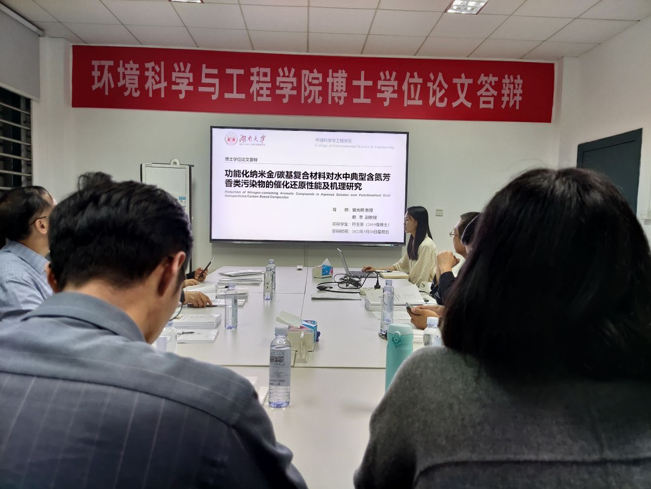 | 博士生符玉葵(湖南大学环境科学与工程学院)于2022年5月20日晚在环境馆一楼会议室顺利通过了博士学位论文答辩。 答辩委员会主席: 牛承岗 教授/博导 (湖南大学环境科学与工程学院) 答辩委员会委员: 尹笃林 教授/博导 (湖南师范大学化学化工学院) 彭 兵 教授/博导 (中南大学冶金与环境学院) 曾光明 教授/博导 (湖南大学环境科学与工程学院) 汤 琳 教授/博导 (湖南大学环境科学与工程学院) 张 长 教授/博导 (湖南大学环境科学与工程学院) 赖 萃 副教授/博导 (湖南大学环境科学与工程学院) 张 辰 副教授/博导 (湖南大学环境科学与工程学院) 答辩秘书: 李 欣 副教授/博导 (湖南大学环境科学与工程学院) 符玉葵博士生论文题目:纳米金/功能化碳基复合材料对水中典型含氮芳香类污染物的催化还原性能及机理研究 导师:曾光明 教授/博导、赖萃 副教授/博导 硝基芳香烃和偶氮染料为典型代表的含氮芳香类污染物造成的水环境污染问题日益突出,因此寻求高效、简单、经济效益好的处理技术对去除水体中这类污染物具有重要意义。催化还原技术是一种高效并可以实现经济效益的污染物处理技术。因此,合适的催化剂是催化还原技术处理这类污染物的关键要素。本论文采用廉价广泛易得的活性焦、炭黑为载体,制备多种纳米金/功能化碳基复合材料,以硝基芳香烃和偶氮染料为典型代表的含氮芳香类污染物为目标污染物,选用硼氢化钠作为还原剂构建催化还原体系,对复合材料的性能和机理进行了深入的研究。 符玉葵博士生基础知识扎实,专业理论知识丰富,具有很好的创新和科研能力。近五年来以第一作者身份在Applied Catalysis B: Environmental (SCI 2020 IF = 19.503)和Chemical Engineering Journal (SCI 2020 IF=13.273)等刊物上共发表高水平SCI论文5篇,并以共同第一作者在Journal of Hazardous Materials (SCI 2020 IF = 10.588)等刊物上发表论文2篇,申请并授权国家发明专利3项,并主持1项湖南省研究生科研创新项目。 攻读学位期间曾获湖南大学博士研究生校长奖学金,湖南大学优秀研究生,惟创奖学金,湖南大学优秀毕业研究生等荣誉奖励。 该学位论文选题具有很强的创新性和前瞻性,综述全面,工作量较大,研究结果具有较高的理论参考价值和实践指导意义;论文的内容与题目相符,结构完整,格式规范,层次清楚,条理分明,引证规范完整;数据详实可靠,图表工整规范,结论正确,成果突出,是一篇优秀的博士学位论文。 在此,对符玉葵博士生通过博士学位论文答辩表示热烈祝贺! ![]() ![]() ![]() ![]() |