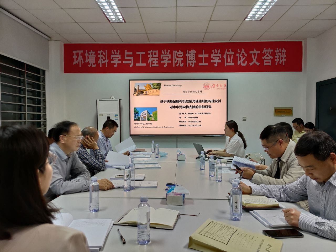 | 博士生陈浩云(湖南大学环境科学与工程学院)于2022年5月23日晚在环境馆一楼会议室顺利通过了博士学位论文答辩。 答辩委员会主席: 牛承岗 教授/博导 (湖南大学环境科学与工程学院) 答辩委员会委员: 尹笃林 教授/博导 (湖南师范大学化学化工学院) 彭 兵 教授/博导 (中南大学冶金与环境学院) 张 长 教授/博导 (湖南大学环境科学与工程学院) 袁兴中 教授/博导 (湖南大学环境科学与工程学院) 李忠武 教授/博导 (湖南大学环境科学与工程学院) 梁 婕 教授/博导 (湖南大学环境科学与工程学院) 答辩秘书: 李 欣 副教授/博导 (湖南大学环境科学与工程学院) 陈浩云博士生论文题目:基于铁基金属有机框架光催化剂的构建及其对水中污染物去除的性能研究 导师:袁兴中 教授/博导 基于半导体的光催化技术被认为是有前景的处理水体中多种污染物的清洁技术之一。本文针对一种新型半导体光催化剂MIL-53(Fe)在光催化去除水体中的抗生素四环素(TC)、环丙沙星(CIP)等有机污染物和As(III)过程中的问题,构建了基于MIL-53(Fe)的复合体系,并通过表征光催化材料的化学组成及微观结构,同时利用多种分析测试手段对光催化过程中的内在机理进行了分析阐述。该研究为基于MIL-53(Fe)的高效光催化体系的构建,及其在水体中污染物的去除方面的应用提供了相关的理论基础和实践方法,具有较好的理论及实践意义。论文研究获得了一些有意义的结果,如,构建了ZnIn2S4/MIL-53(Fe)异质结体系,充分利用了MIL-53(Fe)良好吸附性的结构优势及ZnIn2S4可见光吸收能力强和合适的导带位置的特点,实现对水体中的环丙沙星的吸附-光催化高效去除;在此基础上,将硫引入MIL-53(Fe)骨架中,形成中间能级,实现可见光的更有效激发,同时Fe-S-O框架可以充当可见光激发时的电子导体,实现更高效的光生电子-空穴的分离,该催化剂对水中四环素的去除有良好的光催化效率;通过一步水热法合成了N-CQDs原位修饰的MIL-53(Fe),并将其作为双功能吸附剂/光催化剂去除水体中的As(III),获得了良好的处理效果;通过构建镍掺杂MIL-53(Fe)并耦合氮化碳的多面体复合结构,实现对水体中多种有机污染物,包括CIP、TC及RhB的高效去除。 陈浩云博士生理论基础扎实,专业知识丰富,具有一定的创新和科研能力。近五年来以第一作者身份在Applied Catalysis B: Environmental (SCI 2021 IF=19.503),Separation and Purification Technology (SCI 2021 IF=7.312) 等刊物上共发表高水平SCI论文4篇,授权国家发明专利1项,申请国际专利1项。 该学位论文选题具有较好的理论与实际意义。该论文研究方法正确,实验方案可行,工作量大,数据翔实,文字流畅,逻辑清晰,研究手段丰富,分析较严谨,结论合理。反映出作者具有较好的基础理论及学科专业知识和良好的科研能力,是一篇优秀的博士学位论文。 在此,对陈浩云博士生通过博士学位论文答辩表示热烈祝贺! ![]() ![]() ![]() ![]() |