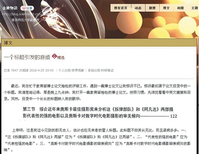 | 教授评审抽检博士论文:差到令人愤怒 南京师范大学教授陈吉德在博客吐槽该论文,贴出部分论文内容,建议追查论文相关单位和作者责任 今年4月25日,南京师范大学教授陈吉德在博客上发文,就一篇博士论文发表看法。网络截图 新京报讯 “只要随便堆砌几万个文字,通过答辩,就能从‘博士生’摇身一变为‘博士’。这样的‘博士’到底价值几何?”今年4月,南京师范大学教授陈吉德在评审一篇教育部抽检的博士论文后,称该论文差到让他愤怒。他在博客中就此事写道,强烈建议教育部有关部门追查论文的相关单位和作者的责任,并做出相应的处理。 论文某一节标题被指“太奇葩” “我从未见过这种让人晕倒的论文,不仅观点完全论述不清,而且通篇都是各种资料堆砌出来的,最可笑的是,标题雷人、语句不通,连小学生都不会犯这种错误。”昨日在接受新京报记者采访时,陈吉德仍然对这篇博士论文耿耿于怀,“事情已经过去一个多月了,现在想起来,还是会血气上涌。” 这是一篇戏剧与影视学专业的博士论文。陈吉德在博客中贴出了部分论文内容并“吐槽”。 论文第八章第三节标题是:综合近年来奥斯卡最佳摄影奖来分析这《拆弹部队》和《阿凡达》两部代表性的强的电影以及奥斯卡对数字时代电影摄影的审美倾向。 陈吉德表示,此标题不但奇长无比,且语病多多:“这《拆弹部队》和《阿凡达》两部”应为“《拆弹部队》和《阿凡达》这两部”;“代表性的强的电影”应为“代表性强的电影”;“奥斯卡对数字时代电影摄影的审美倾向”应为“奥斯卡对数字时代电影摄影审美倾向的影响”。 陈吉德称该标题“太奇葩”,并指出这不但说明学生的水平太差,也说明导师严重不负责任。而该节的内容,就是奥斯卡最佳摄影奖新闻发布的资料,一点儿论文“味”都没有。 12条评审意见涉及文不对题等方面 此外,陈吉德还提到,论文第七章第四节整节全是专家曾接受采访的问答,而第七章第五节的内容只有一个表格,“此节的观点呢?这是论文吗?”他说。 就此,陈吉德提出十二条评审意见,涉及文不对题、逻辑有问题、参考文献少、拼贴痕迹严重、部分章节内容根本不是论文等多个方面。 陈吉德表示,这样的博士论文能够顺利通过,说明某些学校的博士培养已经差到让人触目惊心的地步。可以看出,学生和导师都极不认真,极不负责。他强烈建议教育部有关部门一定追查论文的相关单位和作者的责任,并做出相应的处理。 ■ 对话 “你好我好大家好会让工作失去意义” 陈吉德称他不是炒作,有问题的论文就是应该提出意见 4月25日,在“思想斗争”了大半个月后,陈吉德还是在个人博客上发文,对该论文“不吐不快”,并附上论文的一些内容。这篇博客也因其内容本身以及陈吉德的评论态度,在网络引发新一轮议论,有网友称陈吉德为炒作,也有人认为作为评审专家,陈吉德不应该泄露别人的论文内容。昨日,陈吉德接受新京报记者采访就一些问题进行了回应。 透露论文内容不应该,但实在忍不住了 新京报:你在4月初看到这篇论文,为什么过了半个多月才在博客上发文? 陈吉德:评审专家拿到的论文都是隐去作者相关信息的,就是为了避免评审专家和作者或学校产生联系,有了人情考虑,容易酿成“江湖恩怨”。其实在教育部公布评审结果之前,我不应该透露论文里的内容,但是在那半个多月里,我在“江湖恩怨”和学术良知之间徘徊,最后还是对学术的坚守战胜了我,所以我发了出来,这虽然多多少少不应该,但我实在忍不住了。 新京报:博客发出去一个月了,现在有人来认领论文吗?你要是得知了作者的信息,打算怎么做? 陈吉德:评审工作要在八九月份结束,之后才会告知所在学校。就算我知道是谁的论文,也不会进一步公布他们的真实信息,我是对事不对人。不过我在论文后面写上了12条意见,还附上了我的邮箱,我愿意为我自己的意见负责,随时等待和他们进一步交流。 对导师也需要建立考核机制 新京报:网友对这件事有很多声音,其中包括对你的质疑。 陈吉德:这篇论文里还有更奇葩的内容,我没有贴出来,但是还有人认为我是在炒作。我又不是明星,我要是想炒作,继续把里面的东西再贴出来,还是会吸引人关注。我做这项评审工作五六年了,我觉得有问题的论文,就是应该提出意见,不能给合格,如果都是“你好我好大家好”的态度,这项工作就失去了意义。 新京报:你还说,一篇水平低下的论文能被通过,导师也负有不可推卸的责任。对于导师是否也应有考核机制? 陈吉德:对这篇论文,我最想讽刺的对象不是作者本人,而是他的导师。学生差,可以让他改、让他延期毕业,但是作为导师,一个如此差的论文都能进入答辩流程甚至毕业,实在让人愤怒。 现在一些高校导师存在几个问题,有的人水平够,态度不够;有的人是水平不够,态度够;有的人是都不够。有的学校对导师的评定就是终身制,一朝评上终身无忧,做什么都没人管。但有些学校就建立了导师考核机制,比如我们学校就需要每个导师填资格审核表,把这一年里的学术成果清清楚楚地上报到研究生院,达不到标准就要重新评定职称,这就让人不敢怠慢。所以对导师的考核需要督促机制。 ■ 追问 论文抽检不合格有何后果? 教育部学位与研究生教育发展中心受国务院教育督导办委托,每年进行博士论文评审工作。相关负责