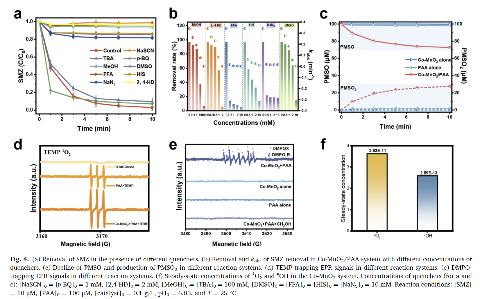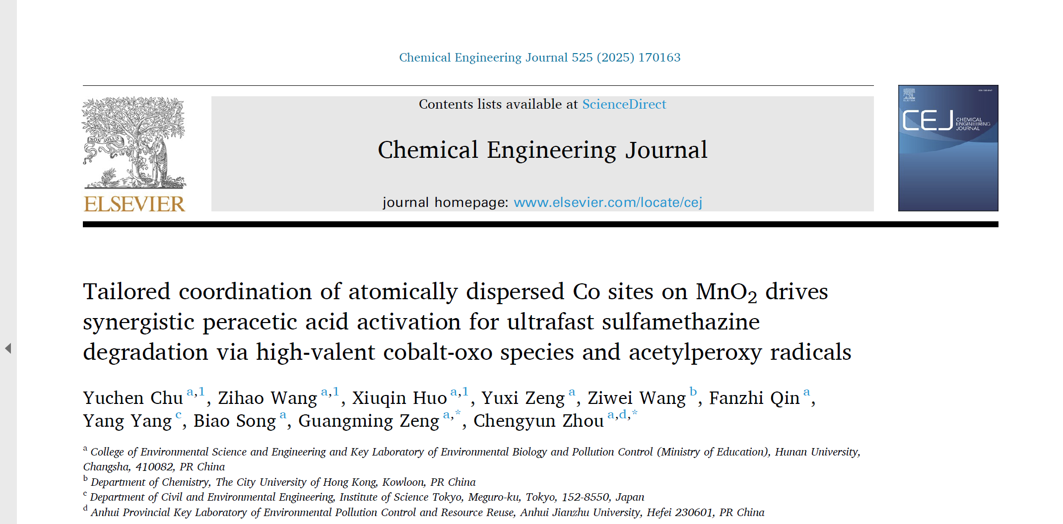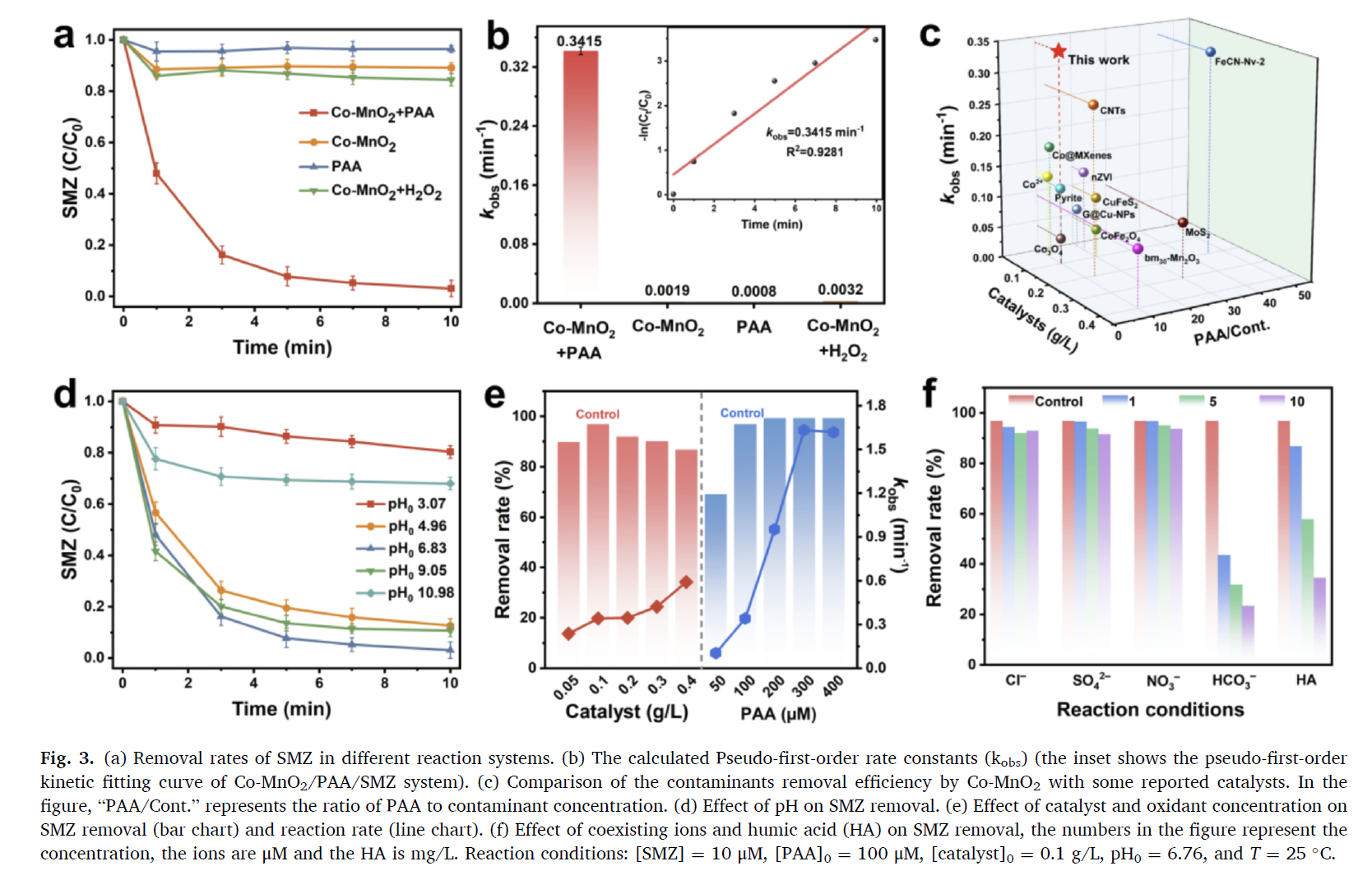 2025级博士生楚雨晨发表CEJ:通过原子级分散的Co位点在MnO2上的定向调控,驱动高价钴-氧物种与乙酰过氧自由基协同激活过氧乙酸,实现磺胺二甲基嘧啶的超快速降解。