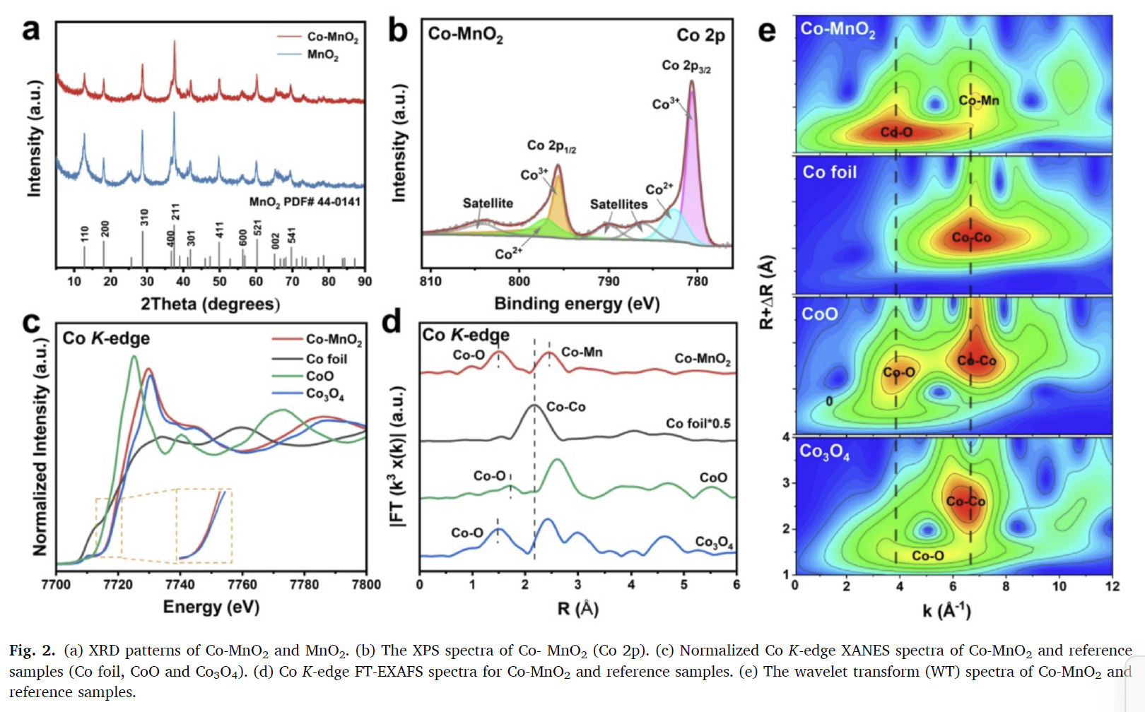 本文采用自合成的MnO2为原料,通过氧化还原与煅烧法理性设计并合成了锚定在MnO2上的钴单原子(Co-MnO2)。首先,通过一系列表征技术对Co-MnO2的结构进行表征,以确认单原子钴的存在。其次,研究了由PAA活化后的Co-MnO2对典型抗生素磺胺二甲基嘧啶(SMZ)的去除性能。