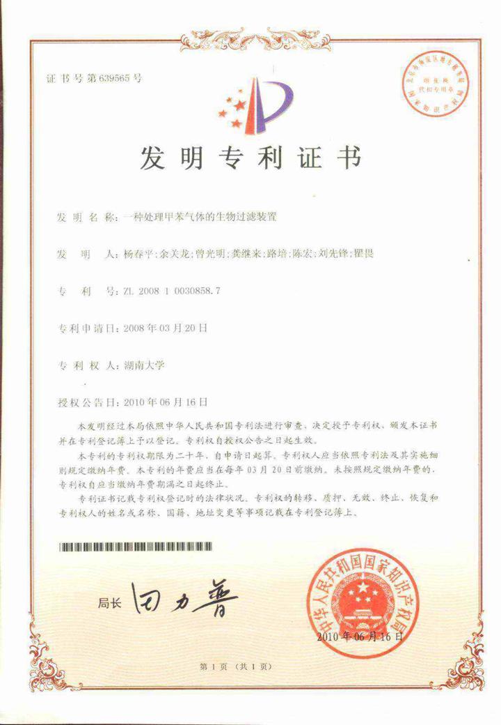 | 2008级博士生(2005级硕士)余关龙(指导教师:杨春平教授、曾光明教授)等人申请的下述发明专利获得授权: 【发明人】: 杨春平, 余关龙, 曾光明, 龚继来, 路培, 陈宏, 刘先锋, 瞿畏 【发明名称】: 一种处理含甲苯废气的生物过滤装置 【专利号】: ZL 200810030858.7 【申请日】: 2008年3月20日 【授权公告日】: 2010年6月16日 【证书号】: 第639565号 【摘要】: 一种处理甲苯气体的生物过滤装置,它的营养液滴加系统的营养液喷头位于生物过滤器的顶端,配气系统的出口通过管路与生物过滤器上端的进气口相连,水浴恒温系统位于生物过滤器外侧,生物过滤器包的外壳体内设有一层或一层以上的整体式生物滤料层,生物滤料层通过每层底部的支撑筛板支承,生物滤料层的过滤介质采用的是均匀的整体式材料,其孔隙率为90%~98%、孔径为1~10 mm、开孔率在95%以上、拉伸强度大于5000 Pa、抗压强度大于1000 Pa、堆积密度为20~600 kg/m3、比表面积为100~1000 m2/m3的材料,生物过滤器的底部开设有与外界连通的排气口和排水管。本发明具有结构简单紧凑、去除甲苯效果好、运行成本低、运行周期长、无二次污染、操作维护方便等优点。 ![]() |