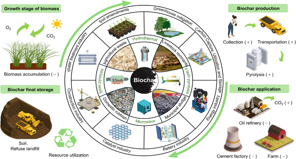 Figure 1. Lifecycle system diagram of biochar. It covers the growth of biomass raw materials, the pyrolysis production of biochar, its application, and its final storage.