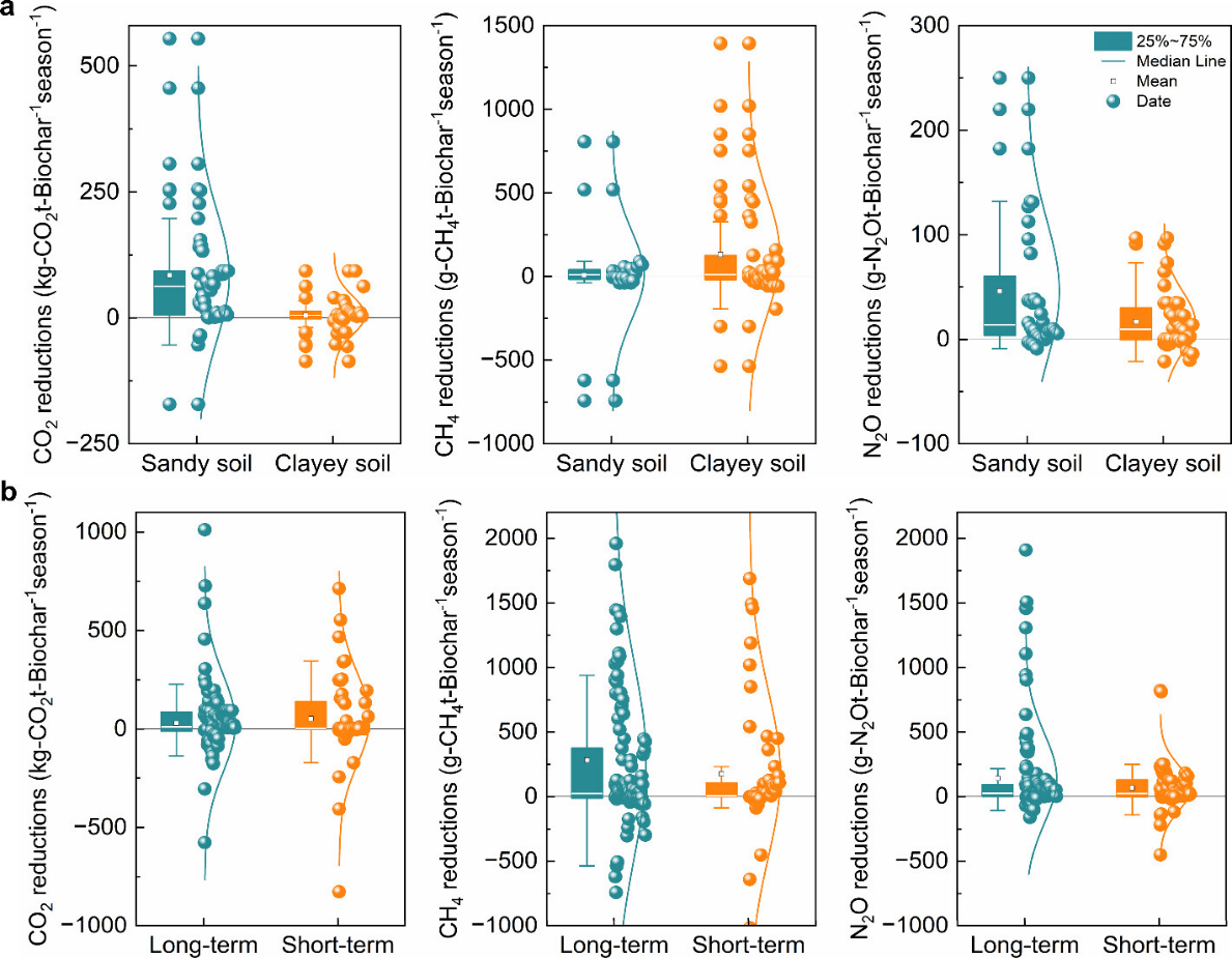 Figure 3. (a) Effects of different soil types (sandy soil, clayey soil) on cumulative emissions reductions of CO2, CH4 and N2O from soil. (b) Cumulative emission reductions of CO2, CH4 and N2O from soil by biochar in short-term and long-term field trials.