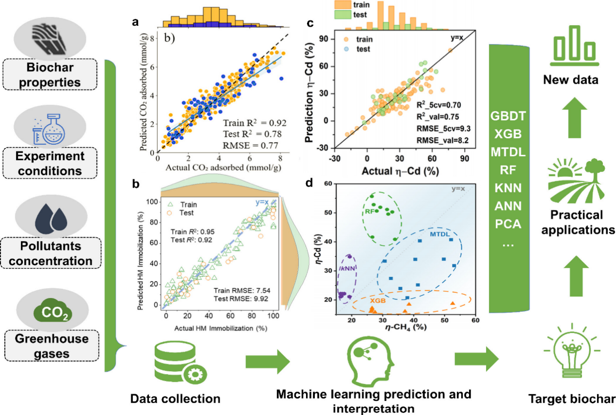 Figure 4. General workflow of machine learning for optimizing synthesis and pollutant adsorption processes of biochar. (a) CO2 adsorption. (b) Soil HM immobilization. (c-d) Synergistic reduction of GHGs and HM.