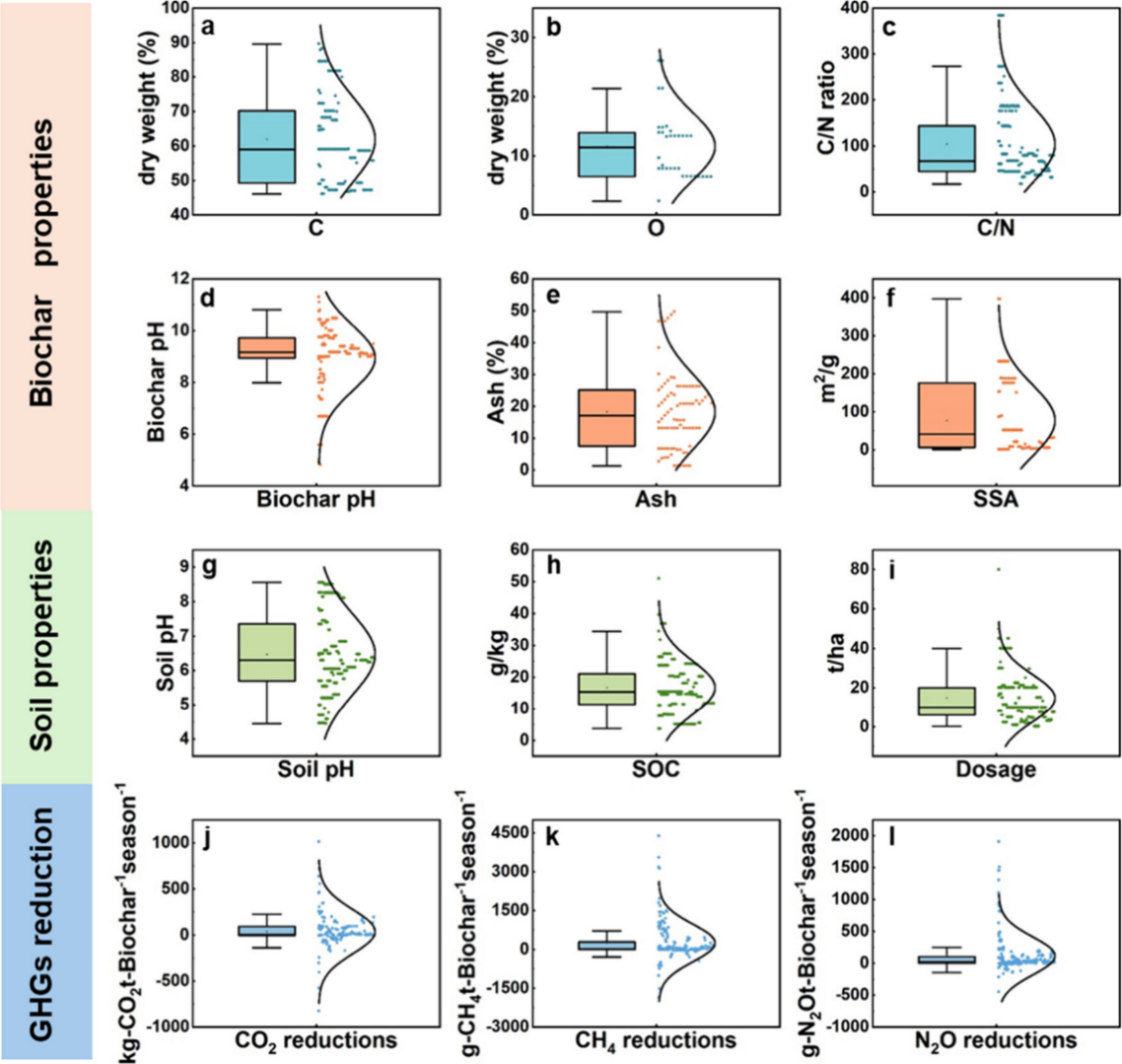 Figure 2. Box-type normality plots of descriptive statistics of different factors for the data collected. (a-c) Biochar C content, O content, and C/N ratio. (d-f) pH, ash content, and specific surface area (SSA) of the biochar. (g-i) Soil pH, soil organic carbon (SOC), biochar dosage, and (j-l) emission reductions of CO2, CH4, and N2O from the soil using biochar additives.