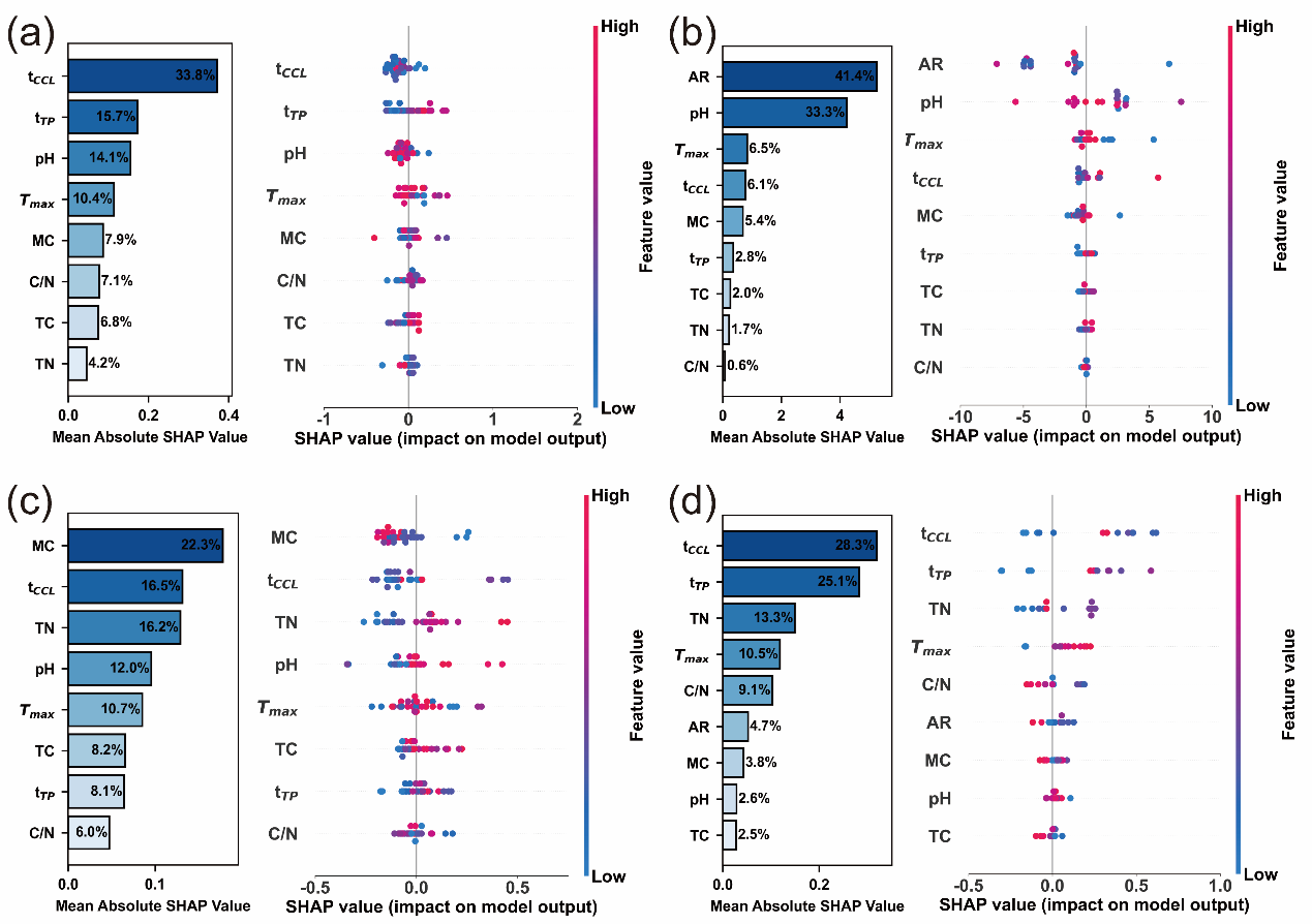 通过SHAP重要性分析和依赖关系分析,揭示了堆肥过程中温室气体排放的关键影响因素及其非线性响应规律,为堆肥过程当中温室气体排放的调控提供了科学依据。结果表明,堆肥周期主导CO2及总温室气体排放,而曝气量和含水率分别显著影响CH4和N2O的排放。因此,适当调节关键变量可有效抑制温室气体释放,如将堆肥周期调整至40天以内。